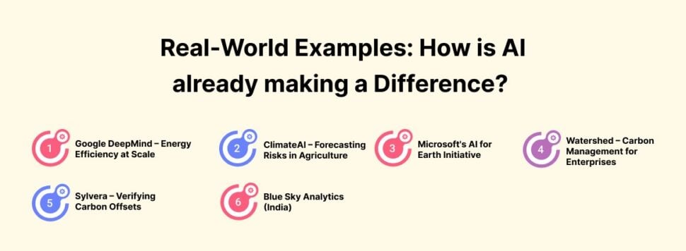 AI-driven climate innovation is not just an idea. It is already happening. Companies everywhere, from the biggest tech titans to smart innovators and startups, are employing smart solutions that utilize artificial intelligence to tackle climate change issues.