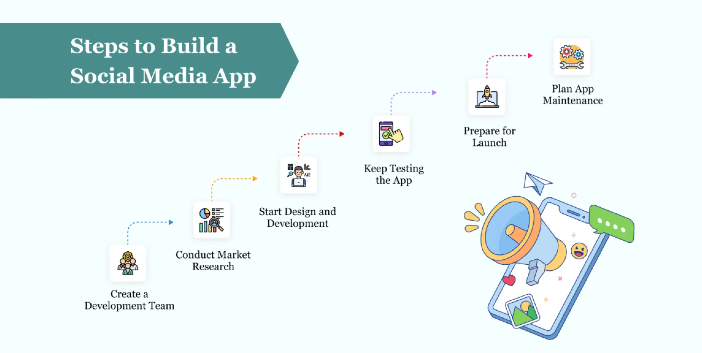 Social media app development includes creating a development team, market research, design and development, app testing, launch marketing, and app maintenance.