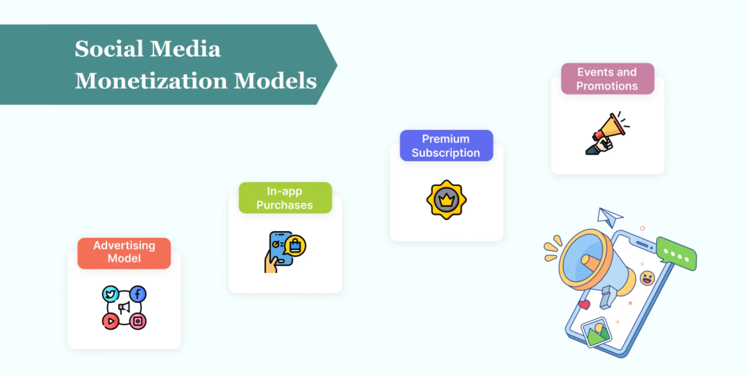 Social media monetization models include advertising, in-app purchases, premium features, and events and promotions.